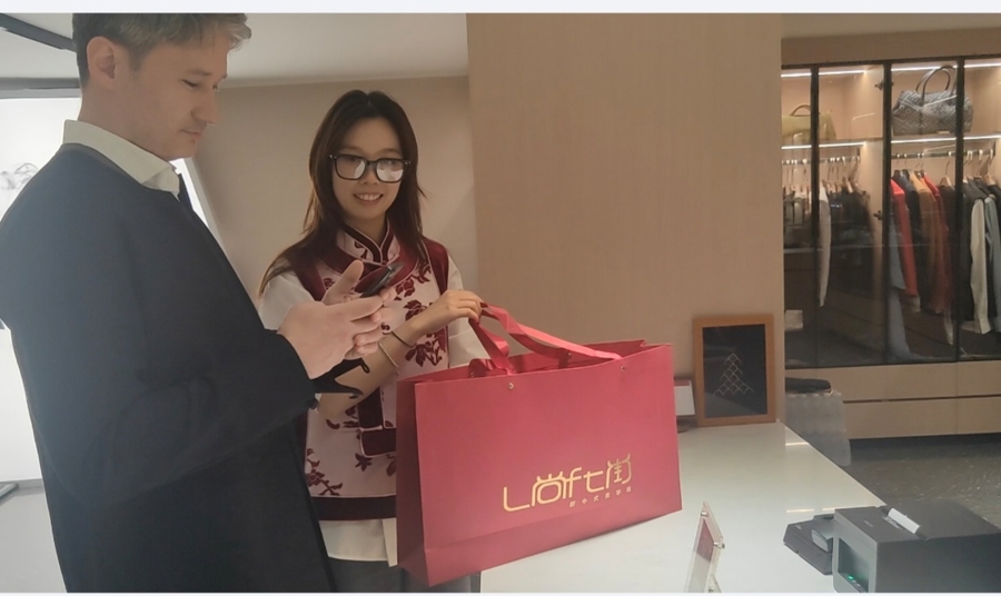马埃尔在旗舰店“中元素”男装品牌前驻足比对。
