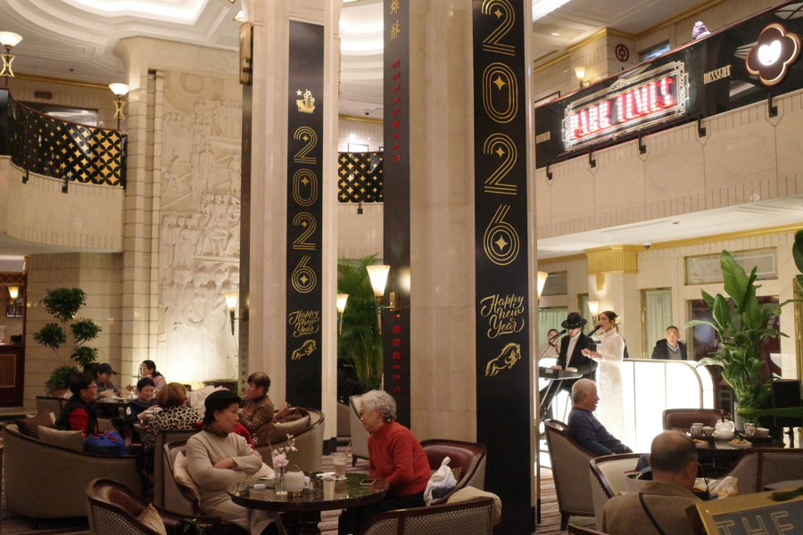 海外饭馆大堂咖啡厅里,古巴乐队The Waves Duo歌手凯瑟琳的爵士歌声,每六合午15点10分准时响起。这支常驻乐队的旋律,流淌在充满Art Deco格调的空间之中,一到春节,更燃烧了往复搭客的热心。